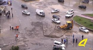Первые этажи домов и улицы Рустави оказались затопленными после сильных дождей и камнепада, который засорил дренажную систему.